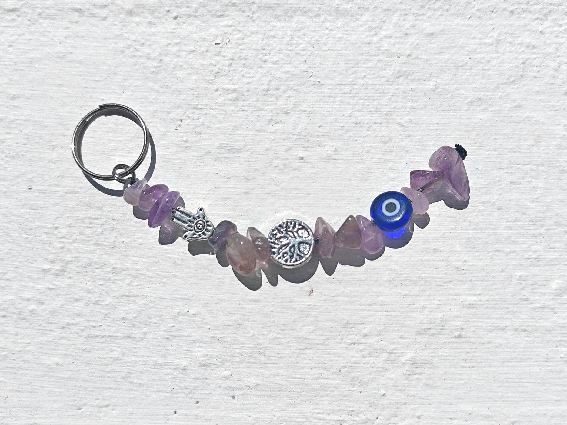 Amethyst Gemstone Keychain – Evil Eye, Hamsa Hand charms
