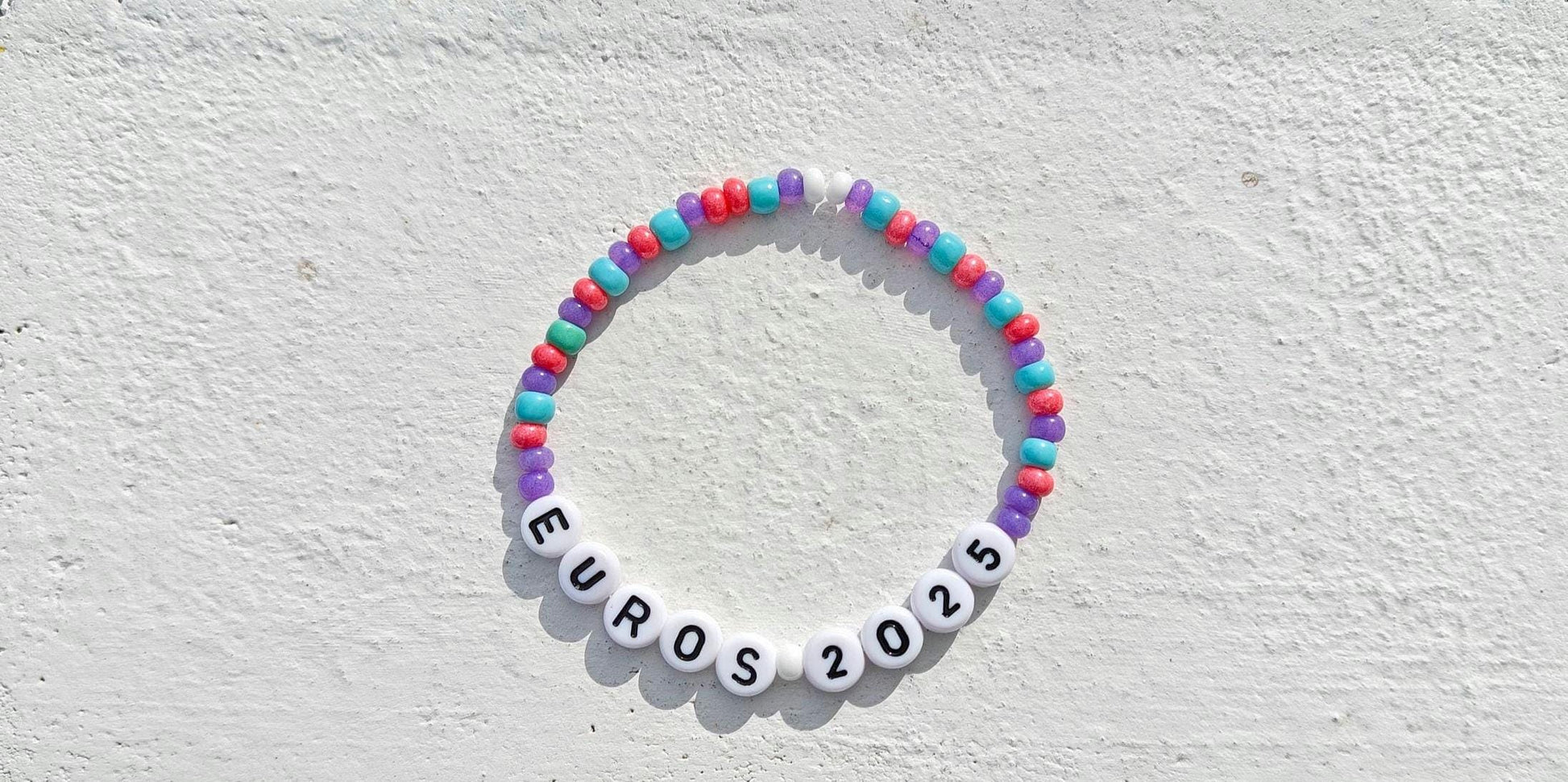 Text beads: “EUROS 2025” in black lettering on white round beads