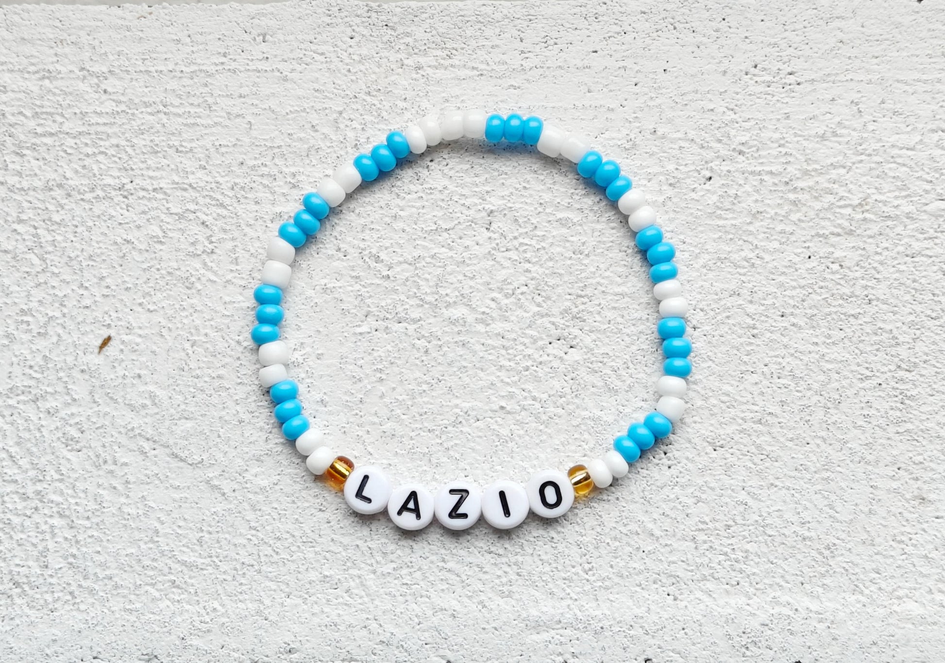 Support Lazio in the soccer league with this on point bead bracelet. Seed beads in colors of blue white and gold are what make this piece the ultimate Lazio bracelet!