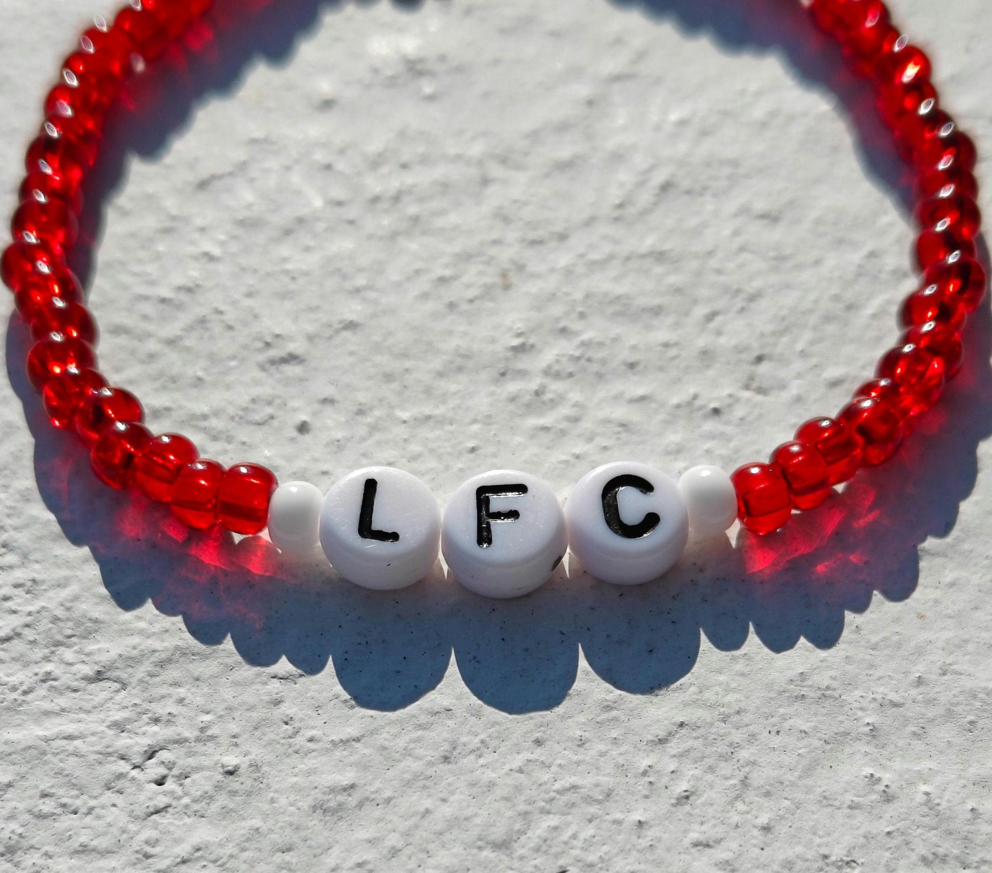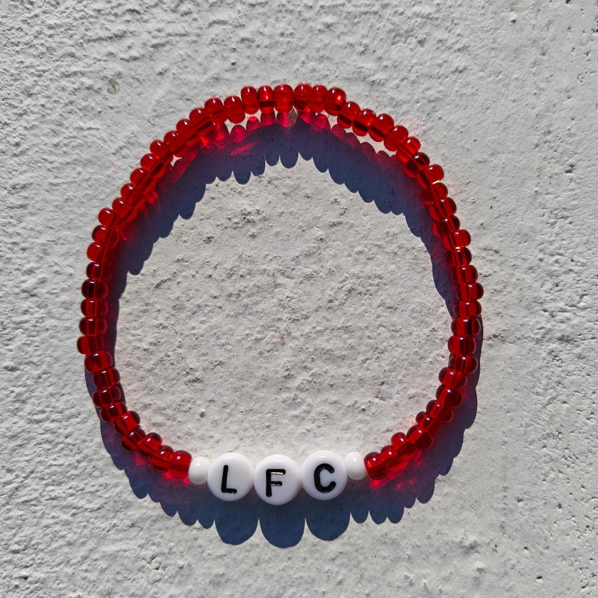 Support your favorite football club in style with this handmade LFC red beaded bracelet, designed for true Liverpool FC fans. Made with vibrant red glass seed beads and bold white alphabet beads spelling “LFC,” this bracelet is a must-have accessory for match day or everyday wear.