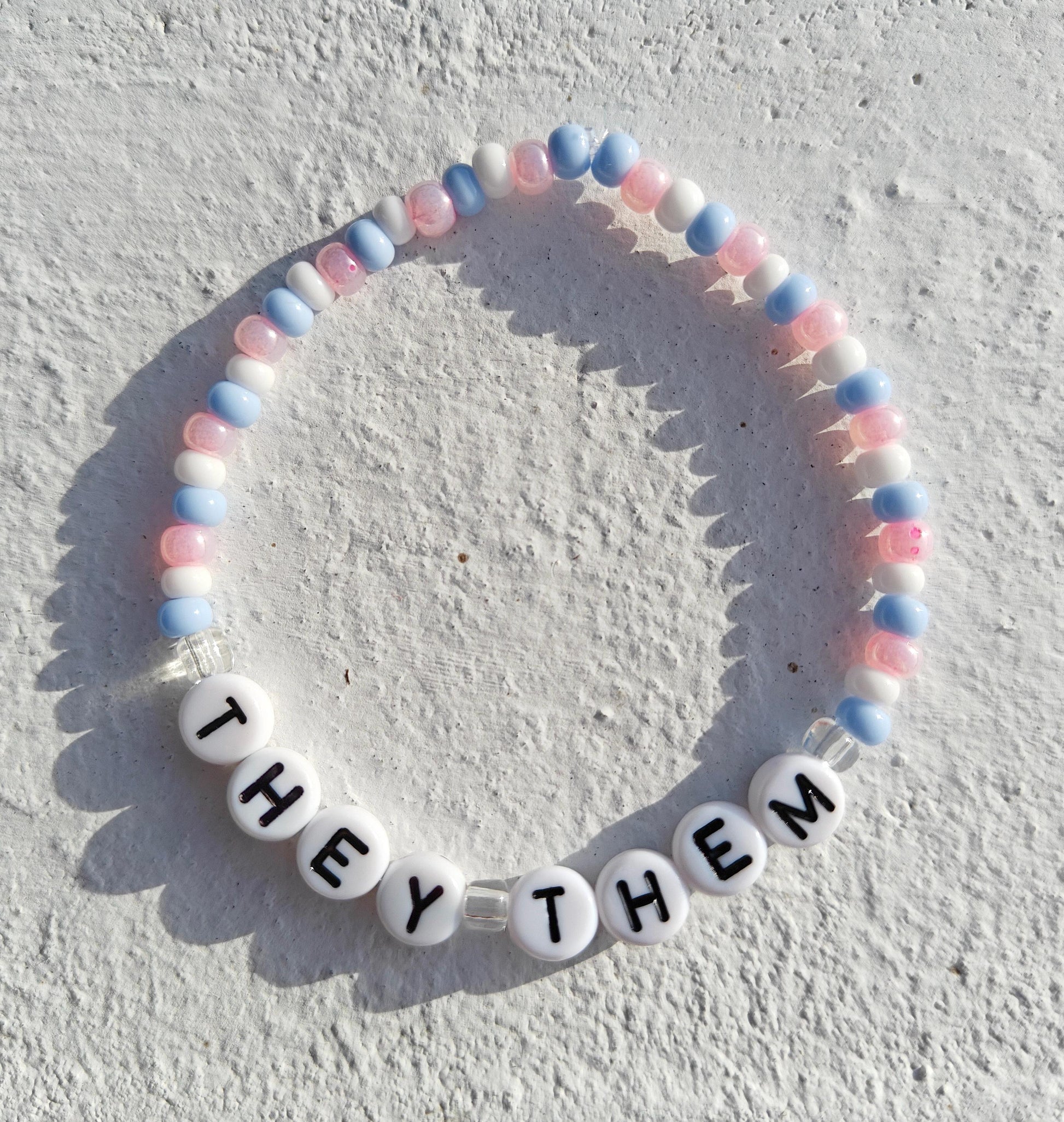 They/Them pronouns bracelet in baby pink white and blue. Can be customized with any pronouns and colors.