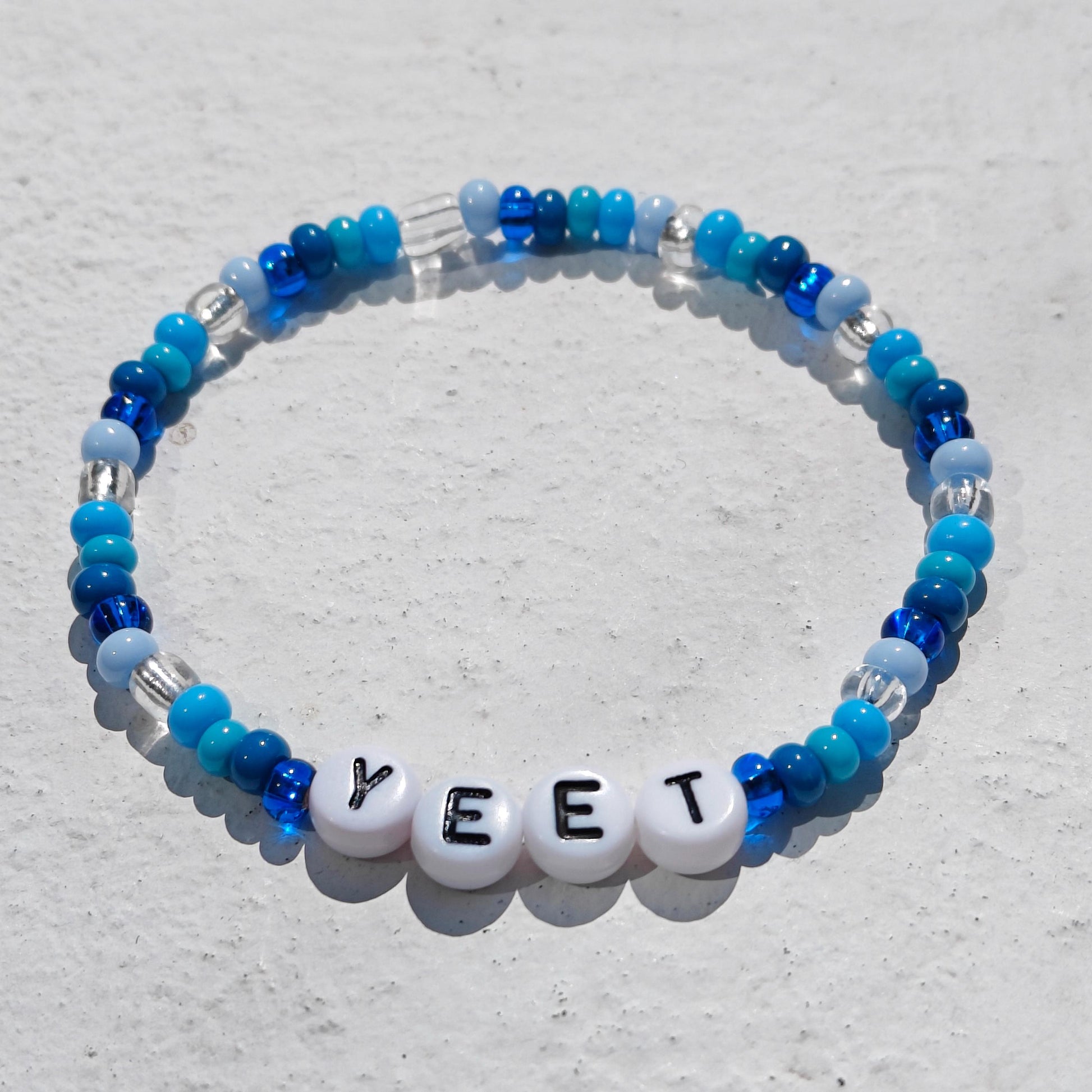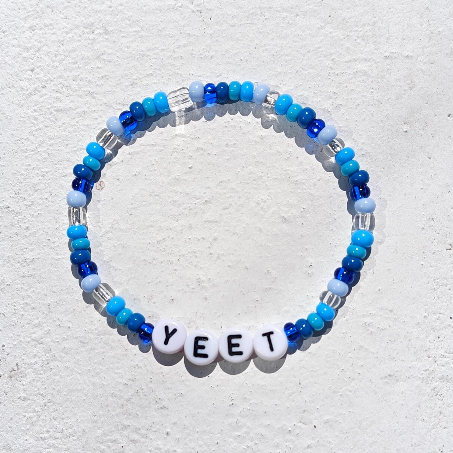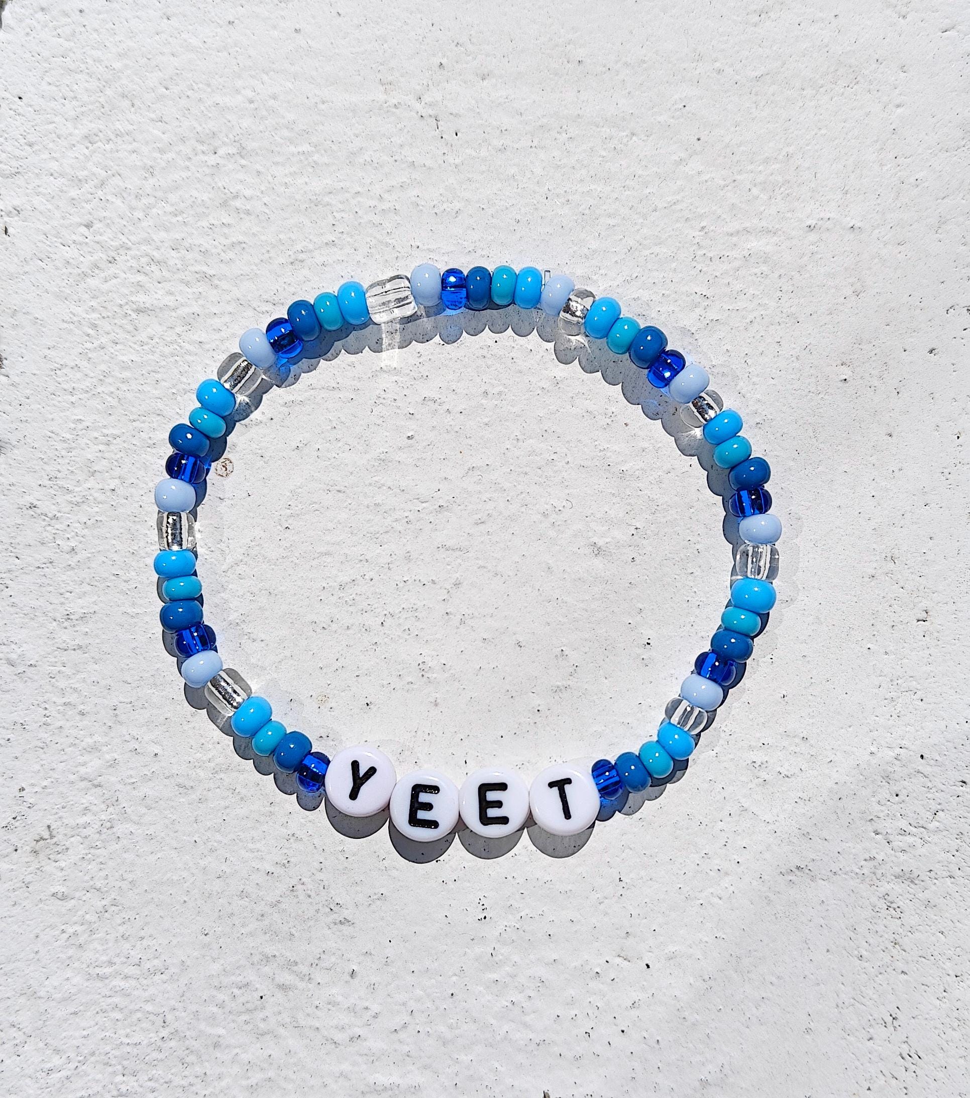 Bring the hype with this bold "YEET" beaded bracelet! Inspired by WWE catchphrases and viral internet culture, this handmade piece features cool-toned blue, white, and translucent beads, with standout white letter beads spelling YEET front and center. It's lightweight, elastic, and perfect for fans of wrestling, memes, and unique aesthetic accessories.